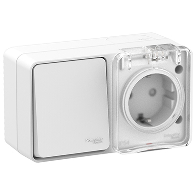 Блок Schneider Electric ATN540170 AtlasDesign Profi54 (выключатель 1-клавишный 10 А + розетка 1-местная 16 А с заземлением, шторками и защитной крышкой) открытой установки, белый