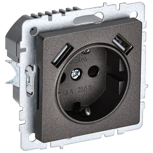 Розетка одноместная IEK РЮш10-2-БрТБ Brite (16 А, IP20) скрытой установки, с заземлением и защитными шторками, c 2 разъемами USB (тип А, 5 В, 3,1 А), темная бронза