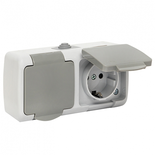 Розетка двухместная EKF EFR16-129-30-54 "Мурманск" (10 А, IP54) открытой установки, с заземлением и шторками, с защитными крышками, серый