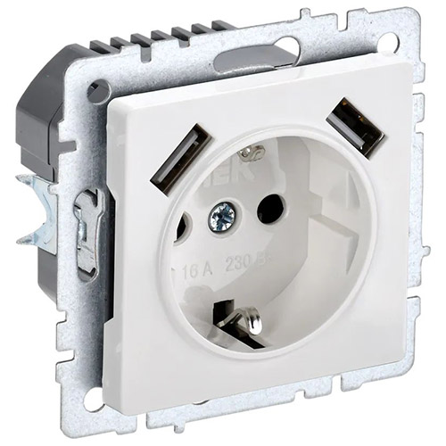Розетка одноместная IEK РЮш10-2-БрБ Brite (16 А, IP20) скрытой установки, с заземлением и защитными шторками, c 2 разъемами USB (тип А, 5 В, 3,1 А), белый