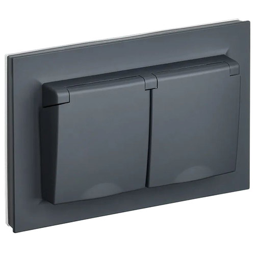 Розетка двухместная IEK РСбш12-3-44-БрГ Brite (16 А, IP44) скрытой установки, с заземлением и защитными шторками, с крышками, в сборе, графит