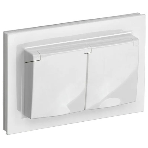 Розетка двухместная IEK РСбш12-3-44-БрБ Brite (16 А, IP44) скрытой установки, с заземлением и защитными шторками, с крышками, в сборе, белый