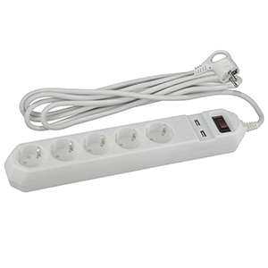 Сетевой фильтр пятиместный USF-5es-1.5m-USB-W "Эра" (USB х 2, ПВС 3 х 0,75 кв.мм, выключатель) с заземлением, белый, 1,5 м