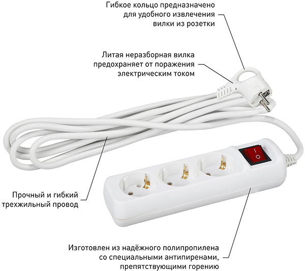 Удлинитель бытовой с заземлением предназначен для подключения электроприборов и электроинструментов мощностью до 3,5 кВт.