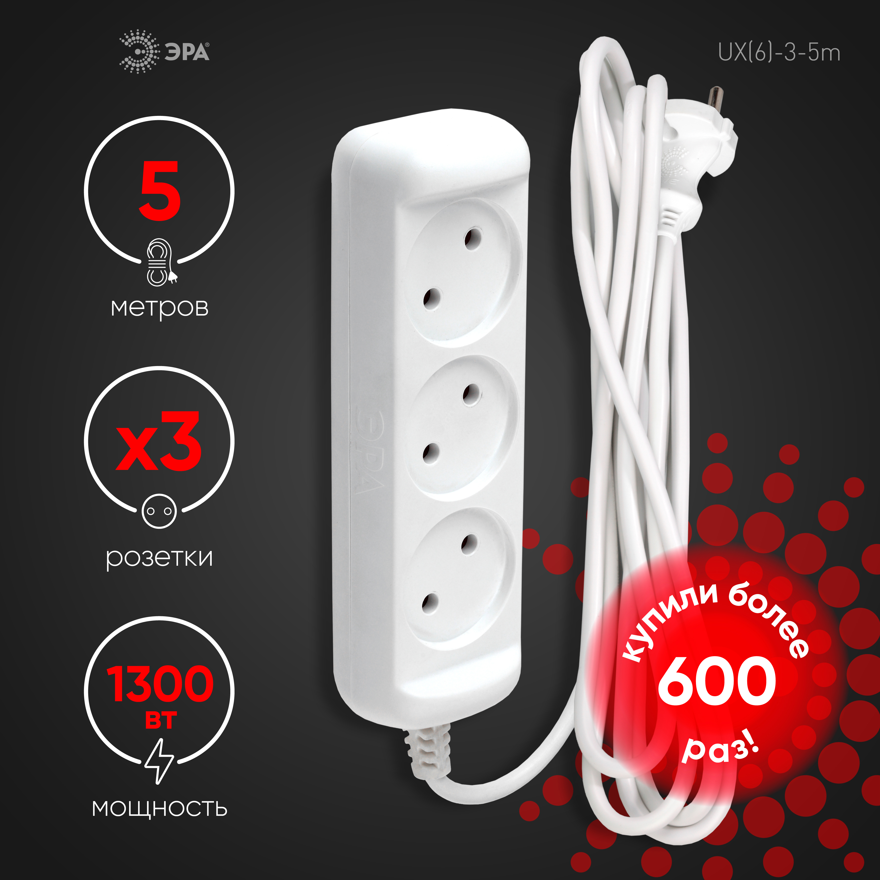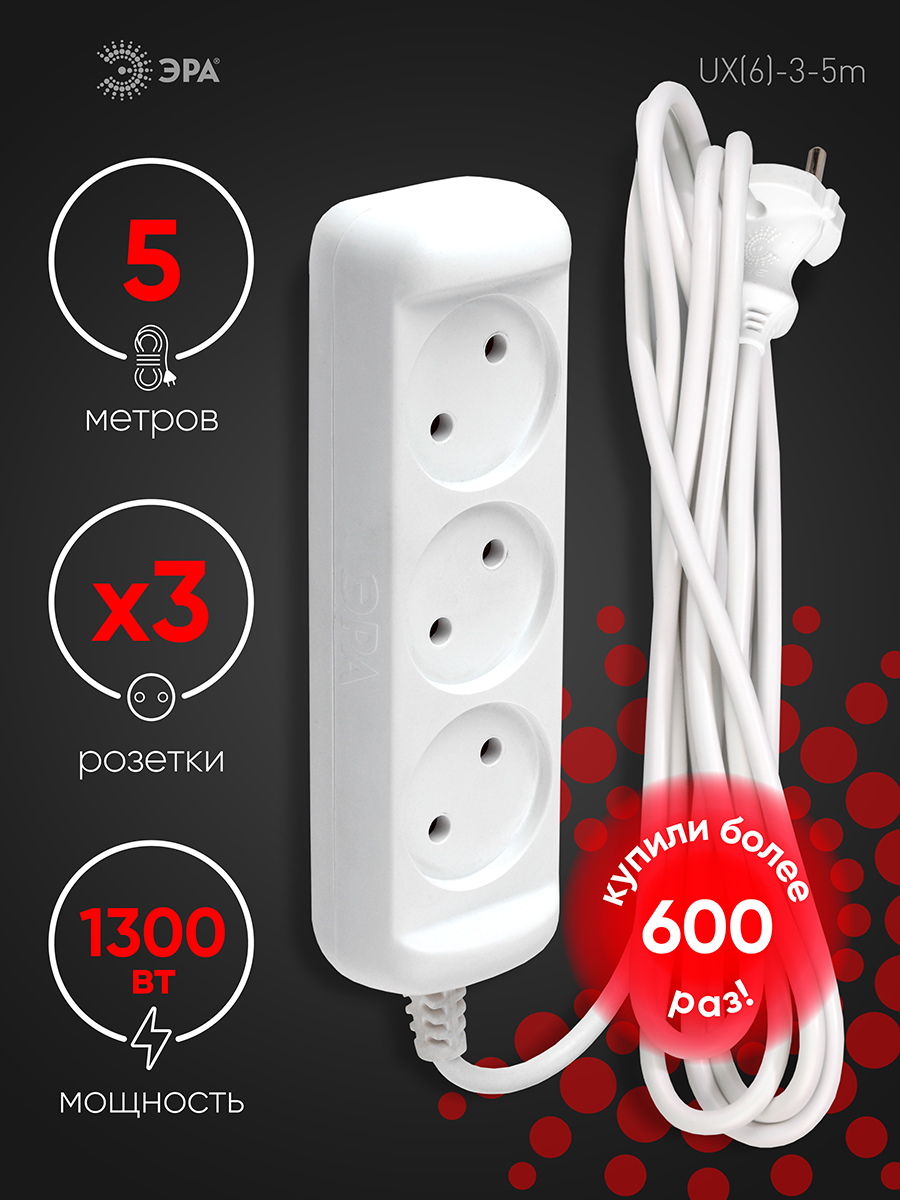 Удлинитель электрический Эра GREENLINE UDL-10-330-ES с заземлением, с выключателем, 3 розетки, провод 3м ПВС 3x0,75мм2. Рассчитан на максимальную мощность 10А/2200 Вт. Удлинитель станет Вашим надежным помощником, если любимые электроприборы находятся далеко от розеток. Корпус выполнен из ударопрочного и негорючего пластика (полипропилен). Вилка обеспечена кольцом для удобного извлечения ее из розетки. Модель удлинителя на 10А позволяет подключить бытовые приборы общей нагрузкой до 2200Вт.