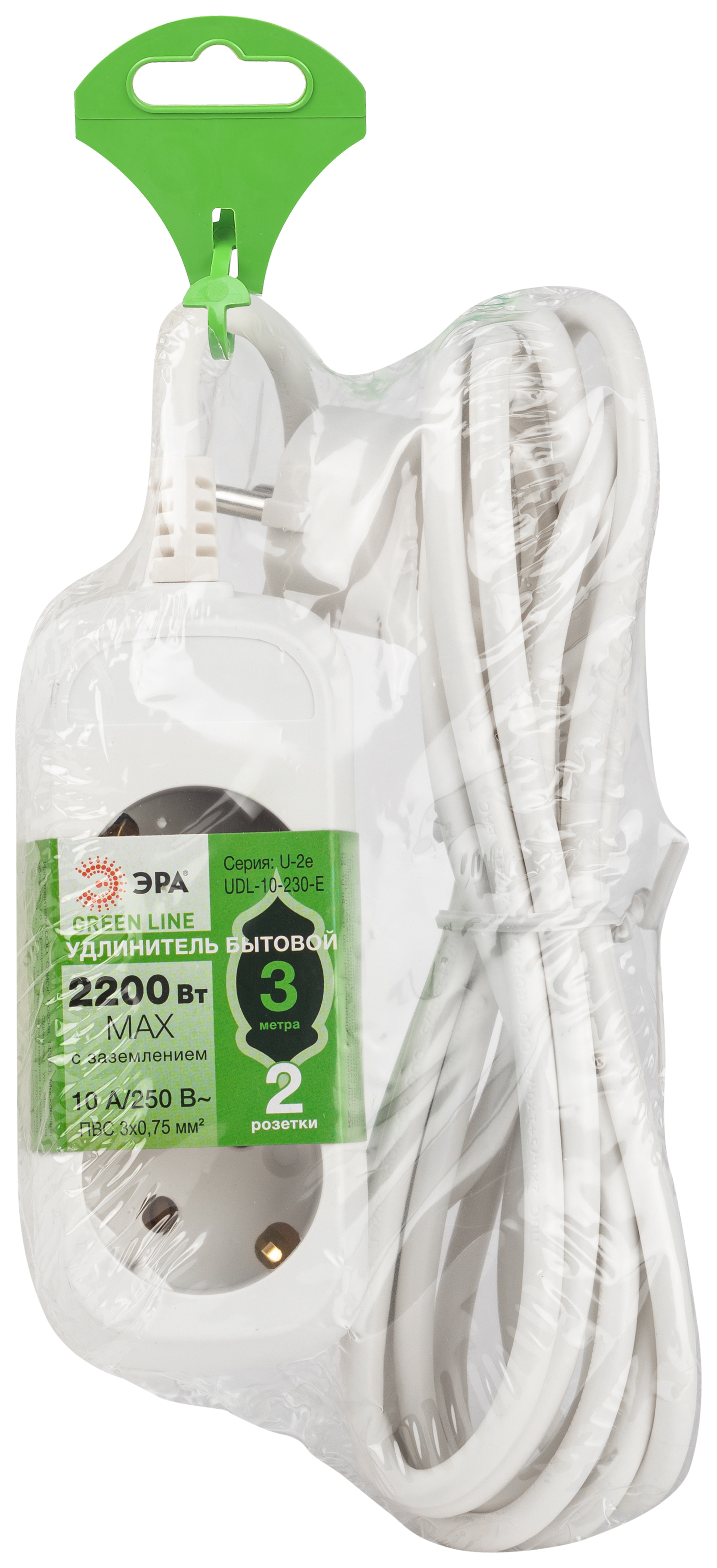Удлинитель электрический Эра GREENLINE UDL-10-230-E с заземлением, 2 розетки, провод 3м ПВС 3x0,75мм2. Рассчитан на максимальную мощность 10А/2200 Вт. Удлинитель станет Вашим надежным помощником, если любимые электроприборы находятся далеко от розеток. Корпус выполнен из ударопрочного и негорючего пластика (полипропилен). Вилка обеспечена кольцом для удобного извлечения ее из розетки. Модель удлинителя на 10А позволяет подключить бытовые приборы общей нагрузкой до 2200Вт.