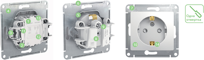 - Удобное подключение проводов: эргономичные клеммы розеток расположены в один ряд, а выключателей - в два ряда: сверху и снизу.