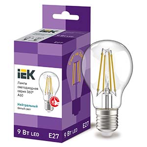 Лампа светодиодная IEK LLF-A60-9-230-40-E27-CL (A60 стандарт, E27, 9 Вт, 1080 лм), прозрачная, цвет свечения нейтральный белый