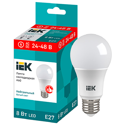 Лампа светодиодная низковольтная IEK LLE-A60-08-24-48-40-E27 (A60 стандарт, 24 - 48 В, E27, 8 Вт, 760 лм), цвет свечения нейтральный белый