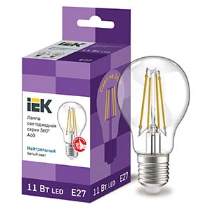 Лампа светодиодная IEK LLF-A60-11-230-40-E27-CL (E27, 11 Вт, 1320 лм, 4000 К). Колба A60 (стандарт) прозрачная. Светодиоды - филаментные нити.