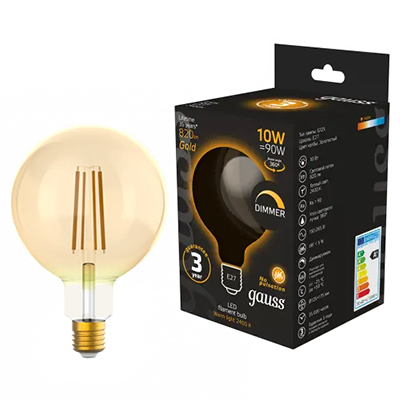 Лампа светодиодная декоративная диммируеммая Gauss 158802010-D Filament (G125 шар, 220 В, Е27, 10 Вт, 820 лм, 2400 К), золотистый