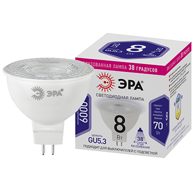 Лампа светодиодная "Эра" STD LED Lense MR16-8W-860-GU5.3 (софит, 220 В, 8 Вт, 650 лм, 6000 К, линза 38°), прозрачный