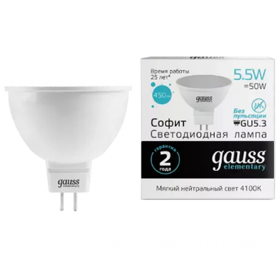 Софитные светодиодные лампы MR16 Gauss серии Elementary имеют сопоставимый галогенным лампам световой поток, но при этом потребляют гораздо меньше электроэнергии.