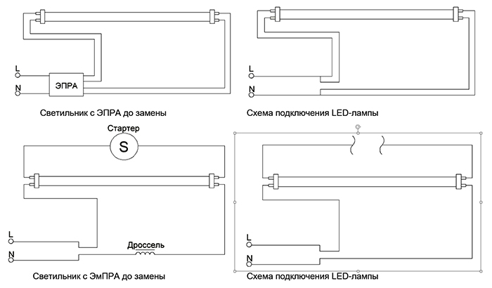 - При замене традиционной люминесцентной лампы на светодиодную лампу в светильнике необходимо произвести демонтаж старой схемы подключения, а именно: удалить или отсоединить дроссель и стартер и подключить светодиодную лампу.