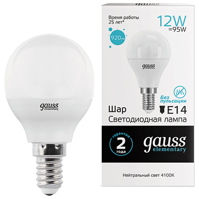 Лампа светодиодная Gauss 53122 Elementary (G45 шар, 220 В, Е14, 12 Вт, 920 лм, 4100 К)