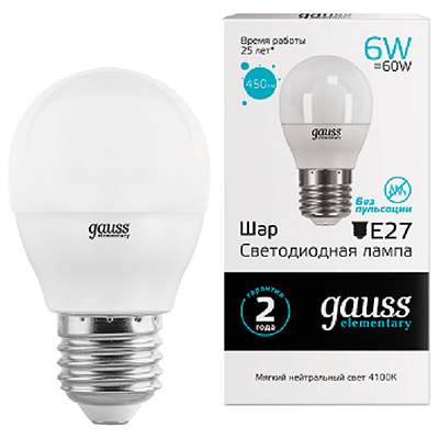 Лампа светодиодная Gauss 53226 Elementary (G45 шар, 220 В, Е27, 6 Вт, 450 лм, 4100 К)