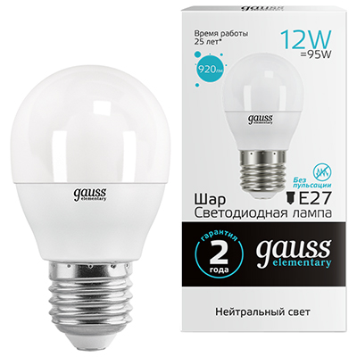 Лампа светодиодная Gauss 53222 Elementary (G45 шар, 220 В, Е27, 12 Вт, 920 лм, 4100 К)