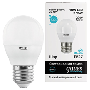 Лампа светодиодная Gauss Elementary 53220 (10 Вт, E27, G45 шар, 920 лм, 4100 К)