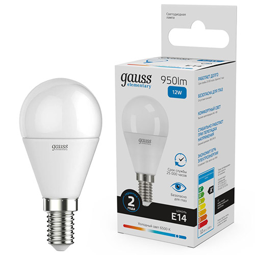 Лампа светодиодная Gauss 53132 Elementary (G45 шар, E14, 12 Вт, 950 лм, 6500 К)
