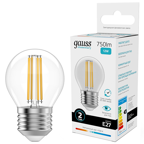 Лампа светодиодная Gauss 52222 Filament Elementary (G45 шар, Е27, 12 Вт, 750 лм, 4100 К, прозрачная колба)