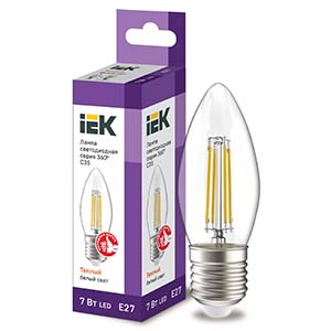 Лампа светодиодная IEK LLF-C35-7-230-30-E27-CL (C35 свеча, E27, 7 Вт, 840 лм), прозрачная, цвет свечения теплый белый
