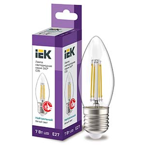 Лампа светодиодная IEK LLF-C35-7-230-40-E27-CL (C35 свеча, E27, 7 Вт, 840 лм), прозрачная, цвет свечения нейтральный белый