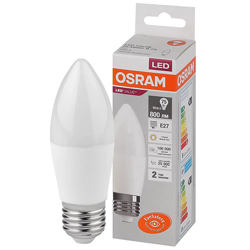 Лампа светодиодная Osram LVCLB75 10SW/830 230V E27 10X1 RU (B75 свеча, 10 Вт, 800 лм, 3000 К)