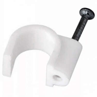 Круглый крепеж кабеля представляет собой дугообразную пластиковую скобу с гвоздем.