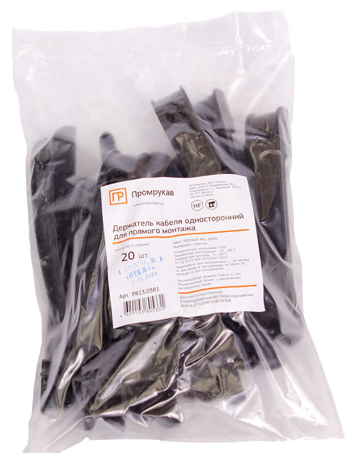 Держатель круглого кабеля односторонний "Промрукав" предназначен для крепления кабеля диаметром до 10 мм при открытой прокладке внутри помещений, либо на улице под навесом.
