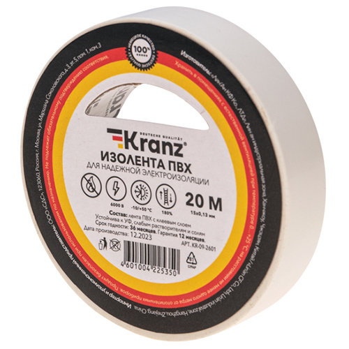 ПВХ изолента Kranz предназначена для электрической изоляции, цветной маркировки, соединения, защиты от внешних факторов и герметизации кабеля, проводов и шнуров.