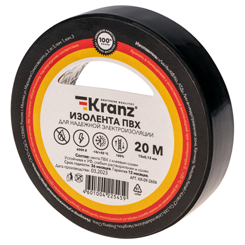 ПВХ изолента Kranz предназначена для электрической изоляции, цветной маркировки, соединения, защиты от внешних факторов и герметизации кабеля, проводов и шнуров.