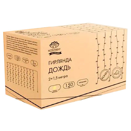 Гирлянда светодиодная занавес 2,0 х 1,5 м Neon-Night 235-516 (150 led, эффект мерцания, соединяемая, прозрачный провод, IP44), цвет свечения теплый белый