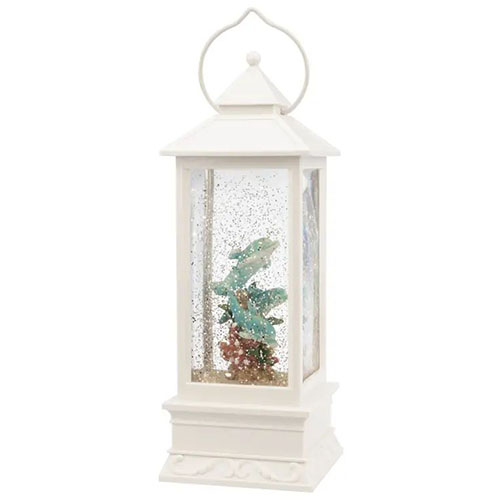 Блестки кружатся вокруг ярких фигурок дельфинов, расположенных в центре колбы из прозрачного пластика.