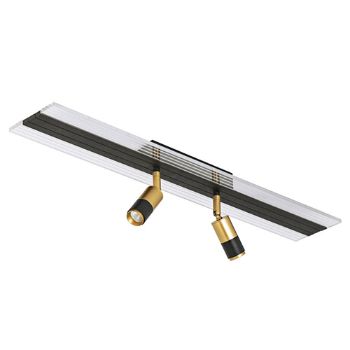 Прозрачный акрил со светодиодной подсветкой пересекает элегантно строгая черная полоса, на которой крепятся два поворотных спота золотого оттенка.