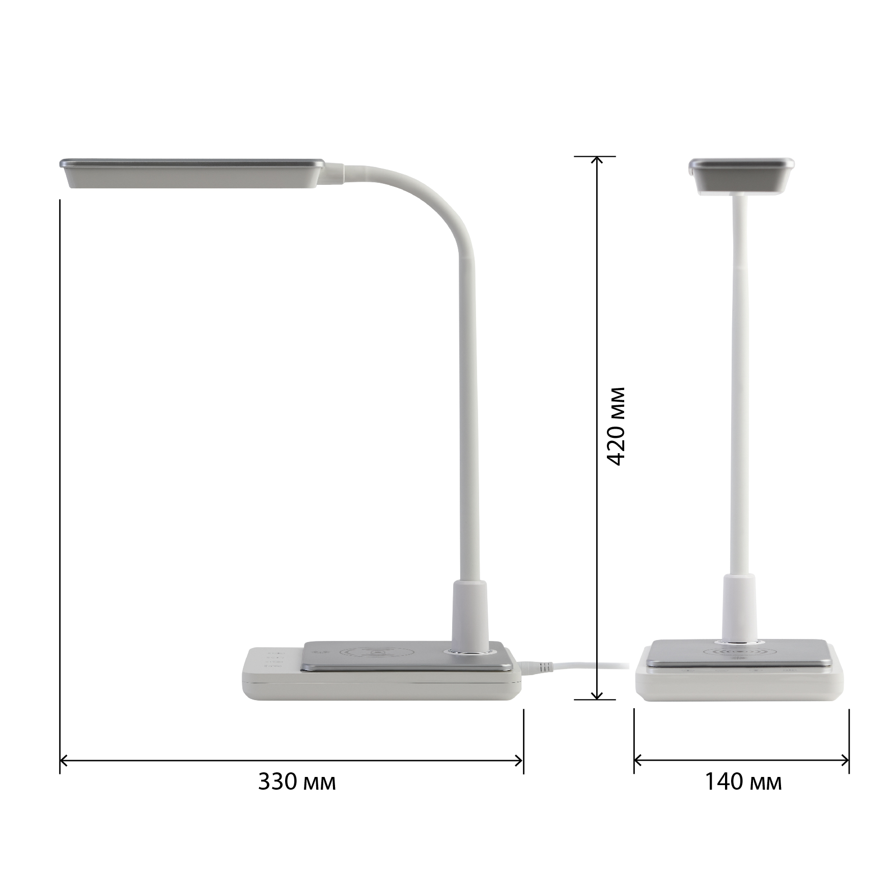 Настольный светильник ЭРА NLED-499-10W-W со светодиодами (LED) в качестве источников света. Оснащен сенсорным управлением с возможностью выбора цветовой температуры (теплый, нейтральный или холодный свет). Плавный диммер для регулировки яркости. Светильник сохраняет выбранные настройки при включении-выключении. Направление света регулируется наклоном и поворотом плафона в любом направлении. Светильник имеет встроенный модуль Qi для беспроводной зарядки мобильных устройств. Просто положите телефо
