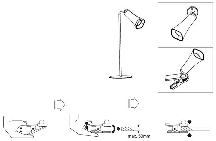на стол (на опору с подставкой), клипсой к поверхности, а также на стену при помощи клейкой платформы.