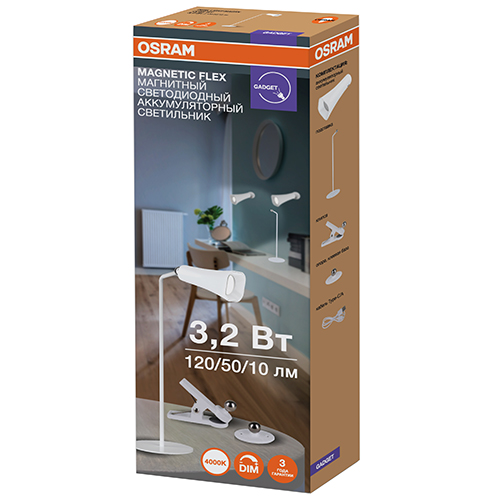 Светильник светодиодный аккумуляторный Desk Light MAGFX Cone WT 1x6 RU Osram (3,2 Вт, 120 лм, 4000 К, подставка, прищепка, клейкая платформа, диммер), белый