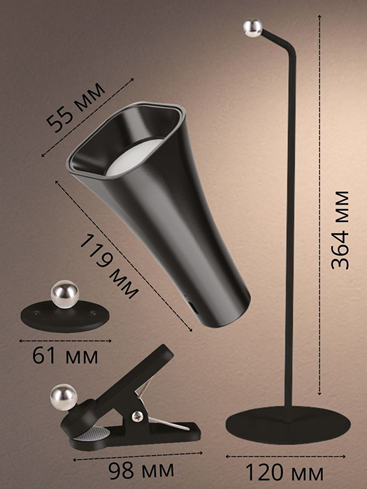 Светильник светодиодный аккумуляторный Desk Light MAGFX Cone BK 1x6 RU Osram (3,2 Вт, 80 лм, 4000 К, подставка, прищепка, клейкая платформа, диммер), черный