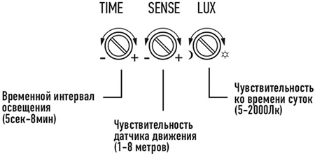 Перед подключением прожектора необходимо выставить регулировки датчика в следующие положения: