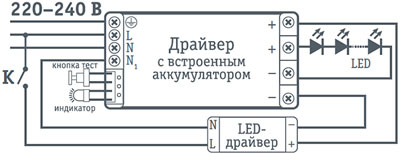 БАП для разборных светодиодных светильников подключаются напрямую к светодиодным модулям светильника, штатный драйвер светильника подключается к БАП параллельно.
